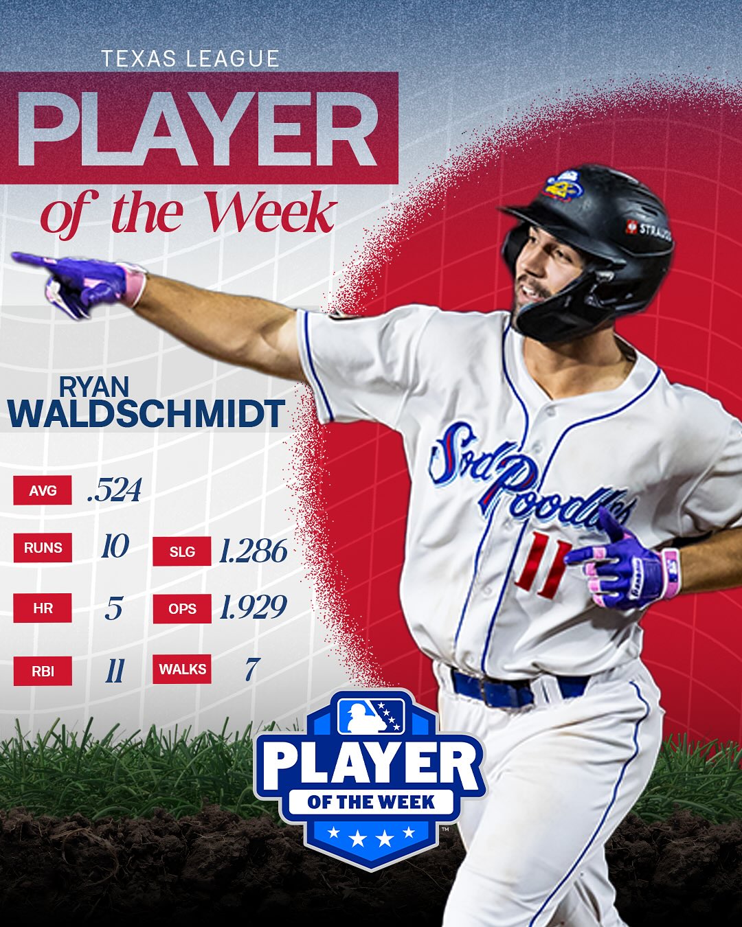 Ryan Waldschmidt has been named @milb’s Texas League Player of the Week! This week, Waldschmidt scored 10 runs, drew 7 walks and collected 11 RBI’s. Ryan became the first Sod Poodle in history to hit 5 home runs in a 3 game stretch!