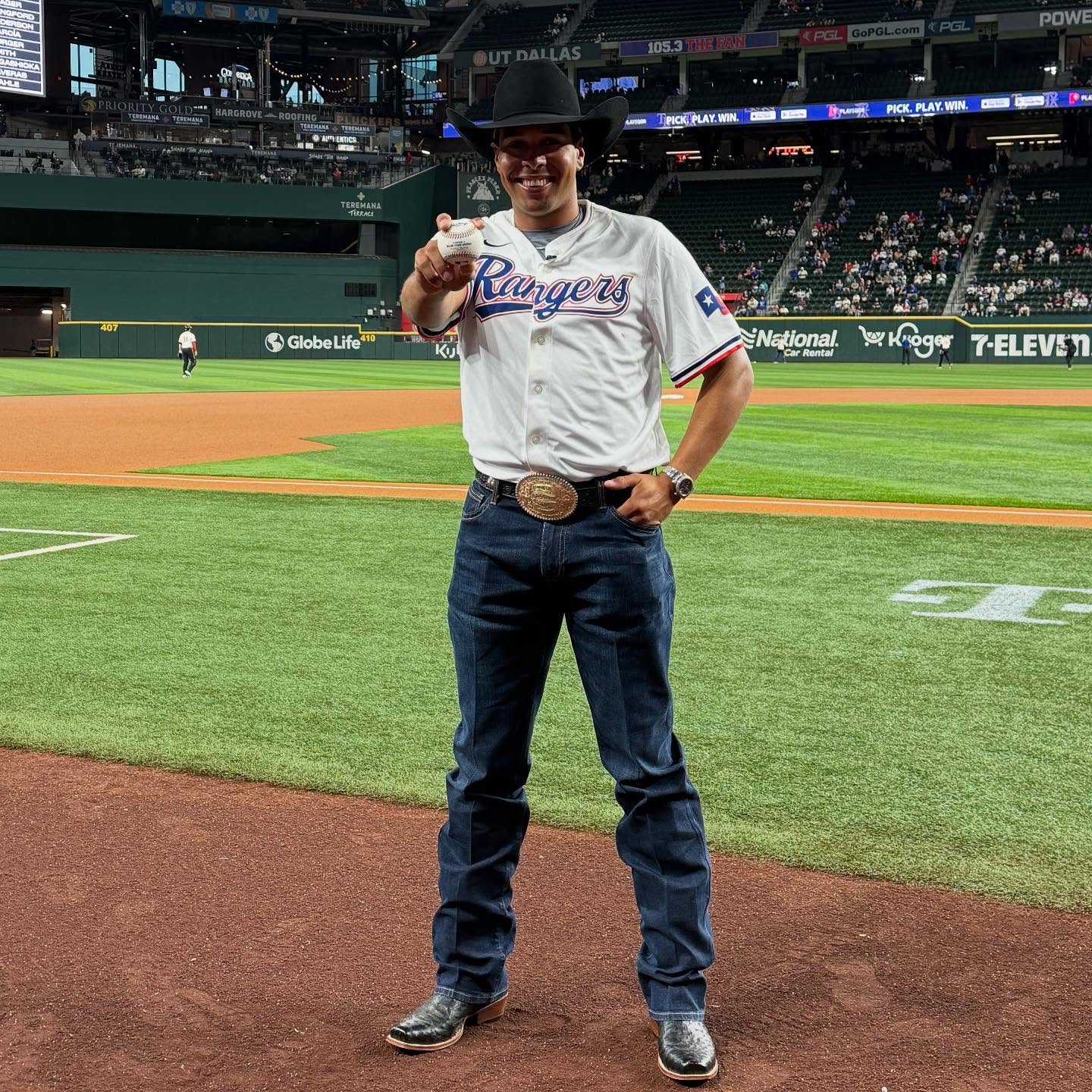 @themoneymayfield traded in the rope for a baseball tonight and took the mound for the first pitch at the @rangers game at @globelifefield to celebrate The American Rodeo being a week away.