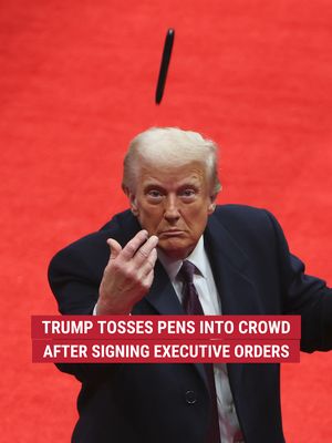 President Trump tosses pens into the crowd after signing executive orders at his inaugural parade, marking his first actions as president.