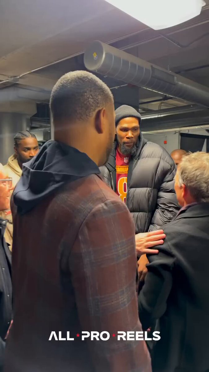 Kevin Durant daps up owner Josh Harris and tells him "two more wins" after the Washington Commanders beat the Detroit Lions in the Divisional Round of the playoffs.
