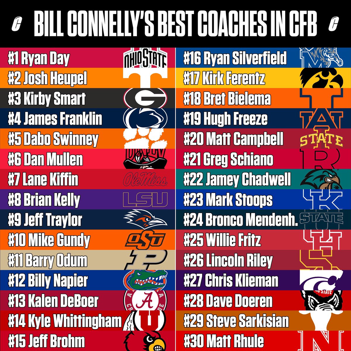Bill Connelly of ESPN ranked the best coaches in college football. What would you change? 🤔