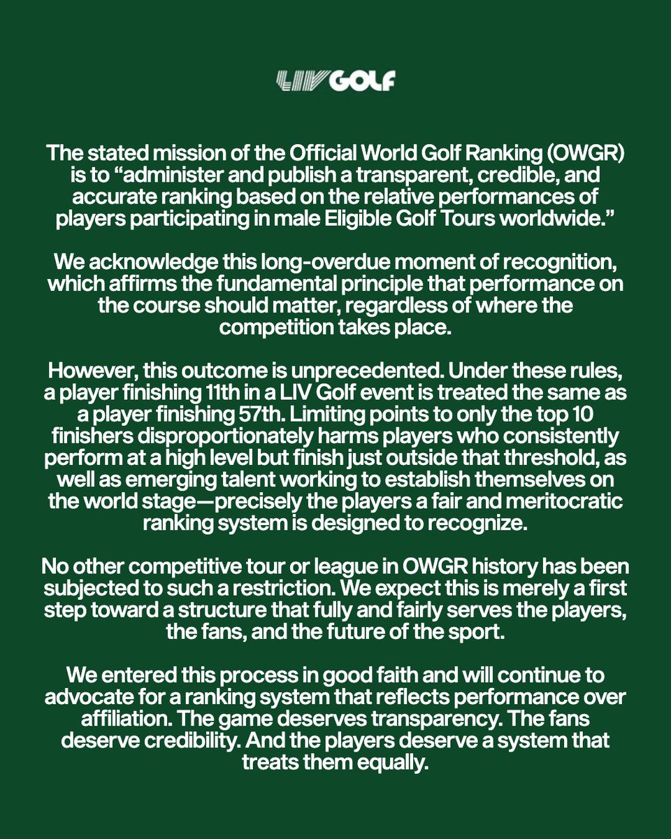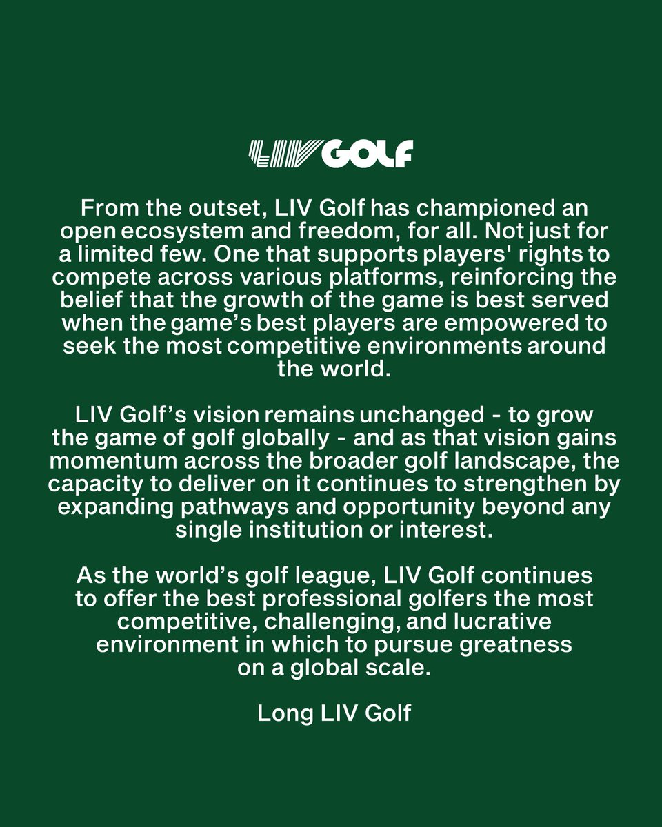 LIV Golf (@livgolf_league) has 299K X followers with a 0.52% engagement rate over the past 12 months. Across 2.21K posts, LIV Golf received 443K total likes and 89.1M impressions, averaging 200 likes per post. This page tracks LIV Golf's performance metrics, top content, and engagement trends — updated daily.
