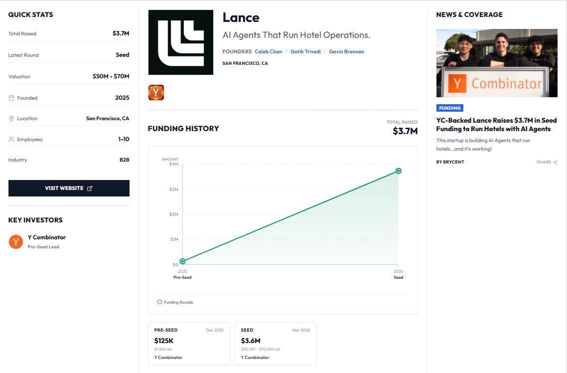 BREAKING: Y Combinator Startup Lance (@TryLance) announces $3.7 million seed funding raise to Build AI Agents that run Hotel Operations! Founders: @calebychan @GavinBrennen @GatikTriv t.co/snUkkpj9zS